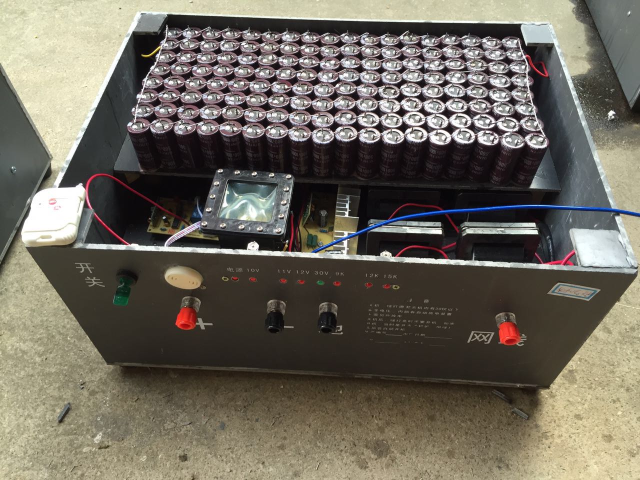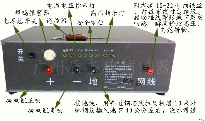 輸出電壓:50萬伏,規(guī)格:50*40*30cm價(jià)格3700。適合捕300-400多斤野豬。適合復(fù)雜山區(qū)、或者茂密森林、或者地表干燥的地區(qū)遠(yuǎn)距離布網(wǎng)使用。最遠(yuǎn)可至5,6公里。帶遙控器,可遠(yuǎn)程遙控自動(dòng)放電。