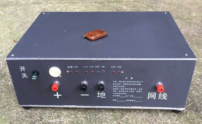 輸出電壓:15萬伏,規格:30*25*20cm,價格1200元。適合捕幾十斤野豬。適合在莊稼地、稻田、丘陵、平原、山區使用。帶遙控器,可遠程遙控自動放電。?